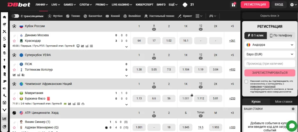 DBbet охватывает широкий спектр событий, позволяя пользователям делать ставки на самые разные направления. На платформе доступны: