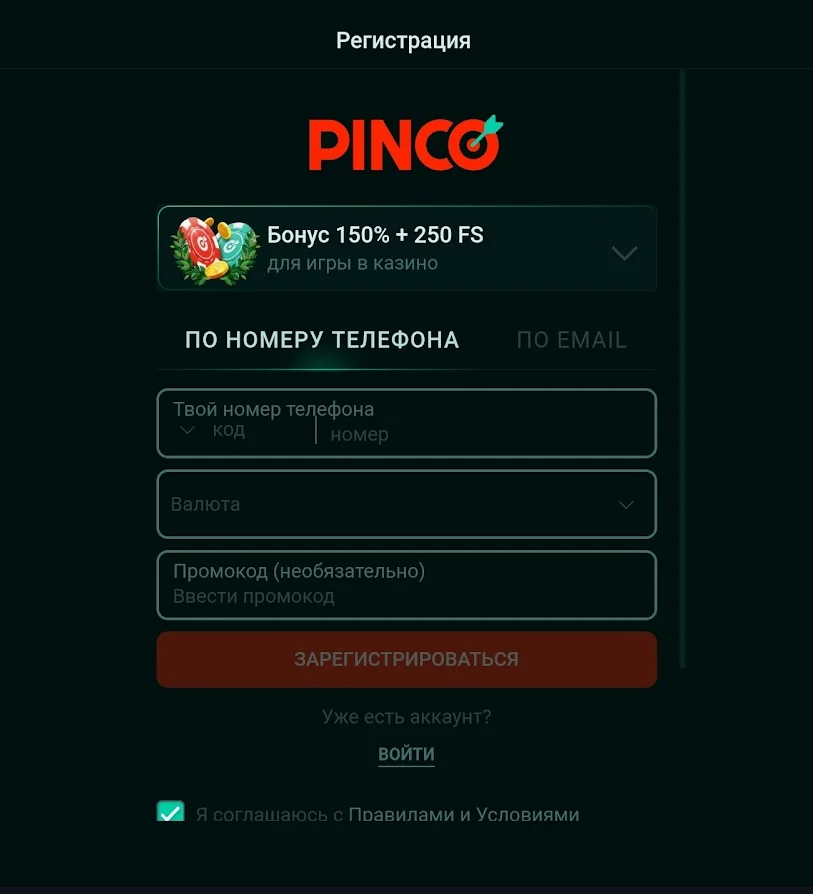 Создать аккаунт в Pinco Casino можно двумя способами: через мобильный номер или с использованием электронной почты. В первом варианте нужно ввести номер телефона и выбрать валюту счета — на смартфон поступит SMS с кодом подтверждения. При выборе регистрации по email потребуется указать адрес почты, задать пароль и выбрать валюту — после этого можно сразу авторизоваться.